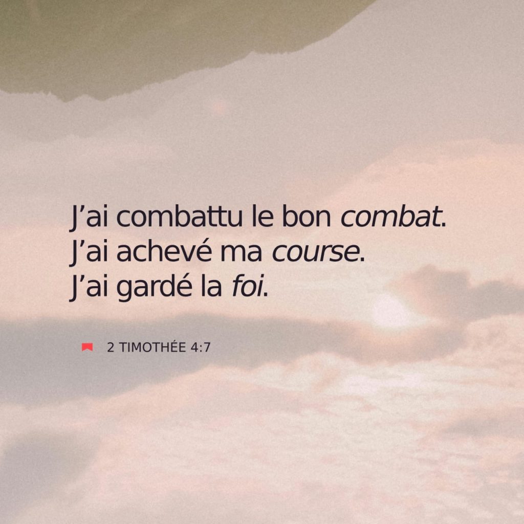 « J’ai combattu le bon combat. J’ai achevé ma course. J’ai gardé la foi. » 2 Timothée 4:7 (BDS) J’aime tellement ce verset qui constitue un condensé du lifestyle chrétien : trois éléments clés, trois leviers, une seule direction. J’ai combattu le bon combat : Dans la vie, combien de fois passons-nous à côté du […]