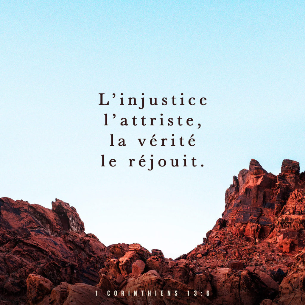« L’injustice l’attriste, la vérité le réjouit. » 1 Corinthiens 13:6 (BDS) https://bible.com/bible/21/1co.13.6.BDS L’injustice l’attriste, la vérité le réjouit. Ce verset révèle le cœur du juste — un cœur sensible à ce qui touche le cœur de Dieu. Trop souvent, nous confondons la justice avec ce qui est simplement égal ou équitable. Mais dans la […]